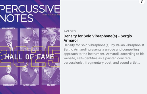 Density for Solo Vibraphone(s), by Italian vibraphonist Sergio Armaroli, presents a unique and compelling approach to the instrument. Armaroli, according to his website, self-identifies as a painter, concrete percussionist, fragmentary poet, and sound artist founding his work “within the language of jazz and improvisation.” Reading this while 15 minutes into a blind listen was illuminating because of how clearly his music reflects his description as an artist. Density totes a fine line between free jazz and avant-garde concert music, and it truly feels like the composer/performer is “painting” sound waves through the vibraphone.